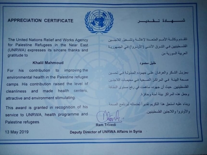 كرّمت “وكالة غوث وتشغيل اللاجئين الفلسطينيين – الأونروا”، في سورية اللاجئ الفلسطيني خليل محمود أحد موظفيها في مستوصف سبينة لتفانيه في عمله طيلة 36 عاماً، ولجهوده المبذولة في تحسين صحة البيئة بمخيمات اللاجئين الفلسطينيين في سورية، التي ساهمت في رفع مستوى النظافة وجعل المراكز الصحية بيئة أمنة وحافزة.