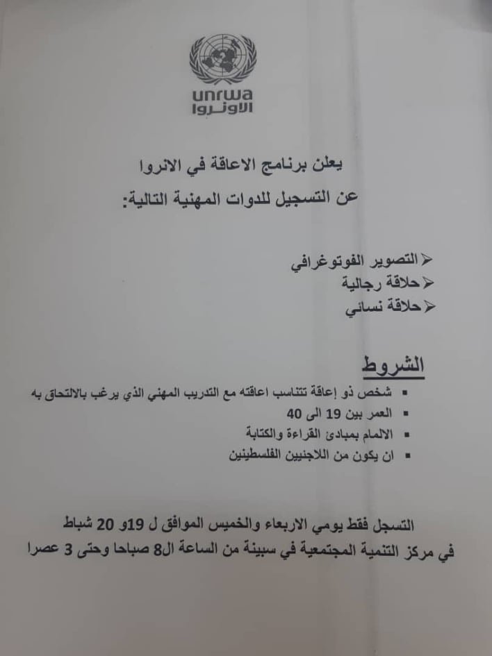 ودعت الأونروا الأشخاص من ذوي الإعاقة (الحركية – الصم)، من كلا الجنسين، للتسجيل في مركز التنمية الاجتماعيّة ببلدة سبينة، من 8 صباحاً وحتى 3 عصراً.