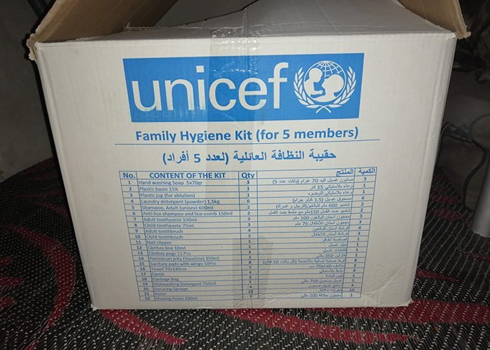 وزّعت إحدى الهيئات الإغاثية الإنسانية التابعة للأمم المتحدة عدد من حقائب النظافة على العائلات المهجرة في مخيمي دير بلوط والمحمدية في مدينة عفرين شمال سورية، وذلك للمساهمة في التصدي لجائحة كورونا والتخفيف من معاناتهم المعيشية والاقتصادية.