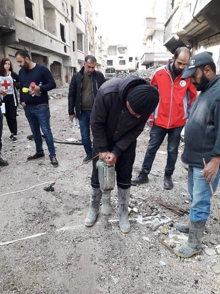 وقال مراسل مجموعة العمل في منطقة جنوب دمشق أن فريقاً من متطوعي وفنيي الصليب الأحمر والهلال بدءوا بوضع خطة لمعالجة خطوط الصرف الصحي، ووضع الريغارات وأبعاد أنابيب الصرف وكيفية معالجة الأضرار بهدف إعادة الأهالي.