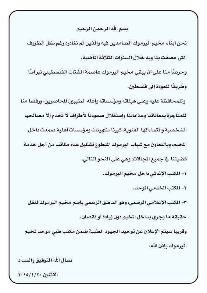 ومن جانبهم أصدر أبناء مخيم اليرموك بياناً أعلنوا فيه عن نيتهم تشكيل عدة لجان هي” المكتب الإغاثي داخل مخيم اليرموك”، و”المكتب الخدمي الموحد”، و”المكتب اإعلامي الرسمي”، وذلك من أجل خدمة المخيم والمحافظة عليه، كما أكد البيان بأنه سيتم الإعلان عن توحيد الجهود الطبية ضمن مكتب طبي موحد لمخيم اليرموك.