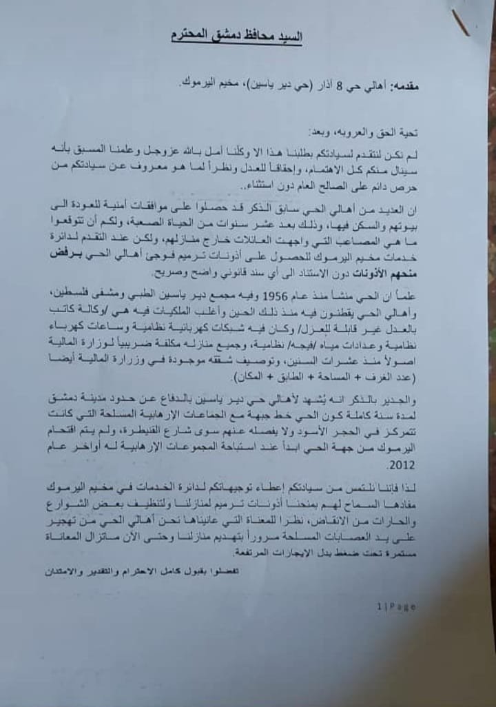 من جانبهم أوضح أهالي حي 8 آذار (حي دير ياسين) في عريضة قدموها إلى محافظ دمشق أنهم فوجئوا عند تقديمهم طلب لدائرة خدمات اليرموك للحصول على أذونات ترميم لمنازلهم التي حصلوا على موافقات أمنية للعودة إليها، برفض منحهم الأذونات دون الاستناد إلى سند قانوني واضح وصريح.