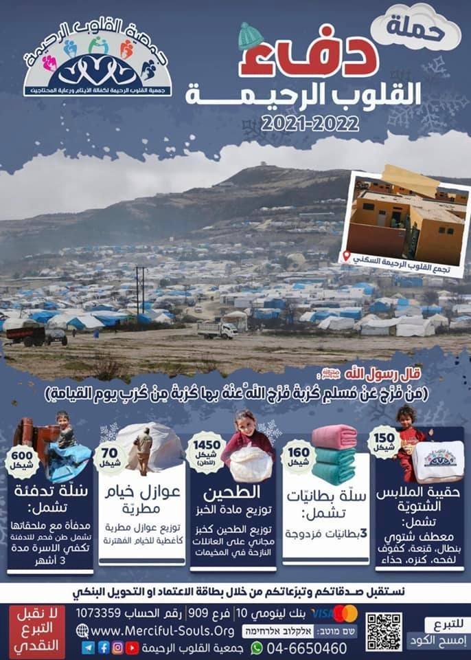 في حين أطلقت جمعية “القلوب الرحيمة” حملة “دفء القلوب الرحيمة” التي جمعت حوالي مليون دولار بعد نحو أسبوع على إطلاق الحملة.