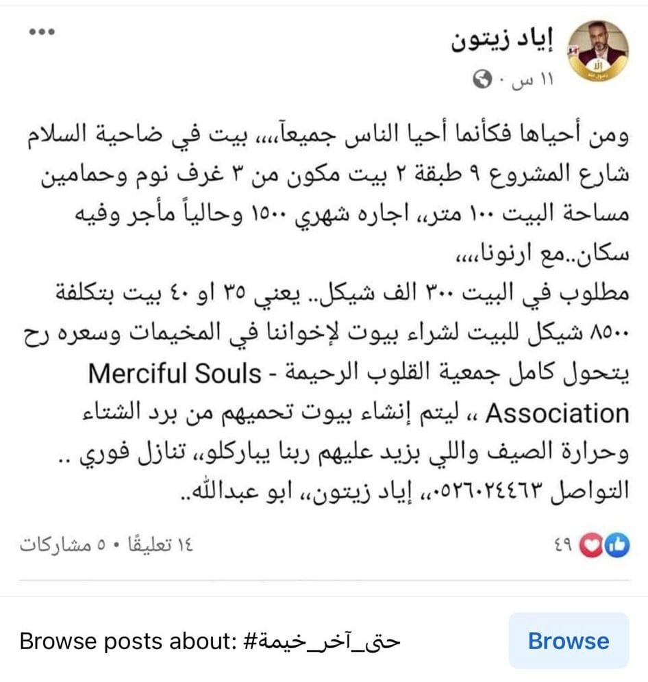 في حين عرض الشاب الفلسطيني “إياد زينون” منزلَه للبيع في ضاحية السلام بالقدس بهدفِ التبرع بثمنِه من أجل بناء منازلَ للنازحين في الشمال السوري.