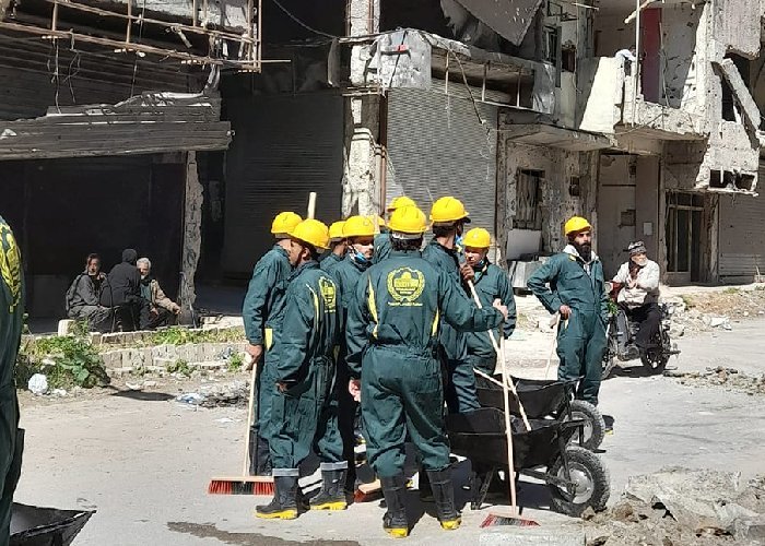 نظمت جمعية القدس الخيرية حملة تنظيف للشوارع والحارات التي يقطنها أهالي مخيم اليرموك جنوبي العاصمة السورية دمشق، من مخلفات القصف، وفتح الطرقات التي أغلقت بأنقاض المنازل المدمرة، إضافة الى جمع وترحيل النفايات.