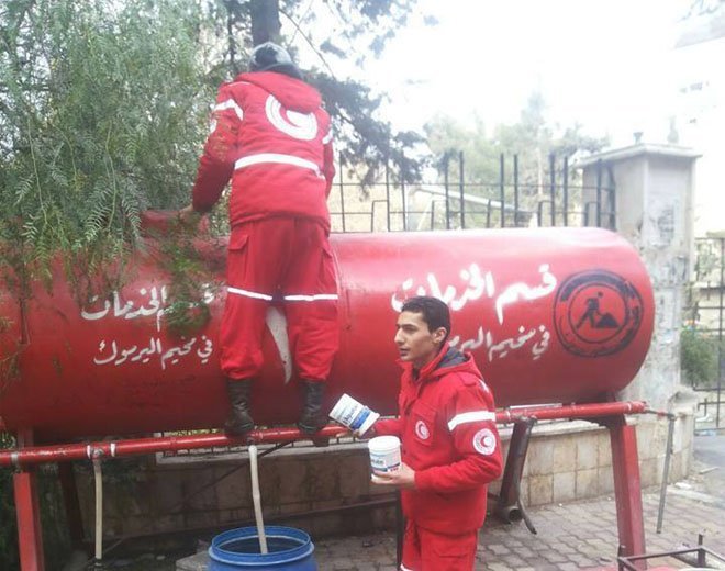 في ظل استمرار انقطاع المياه عن مخيم اليرموك للاجئين الفلسطينيين جنوب دمشق منذ أكثر من( 490) يوماً على التوالي، قامت لجنة متطوعي مخيم اليرموك بتعقيم مياه الآبار الارتوازية داخل المخيم بحبوب التعقيم المقدمة من قبل اللجنة الدولية للصليب الأحمر والقسم الطبي التابع لوكالة الأونروا، وذلك ضمن حملتها المستمرة للتخفيف من تلوث تلك المياه وجعلها صالحة للشرب.