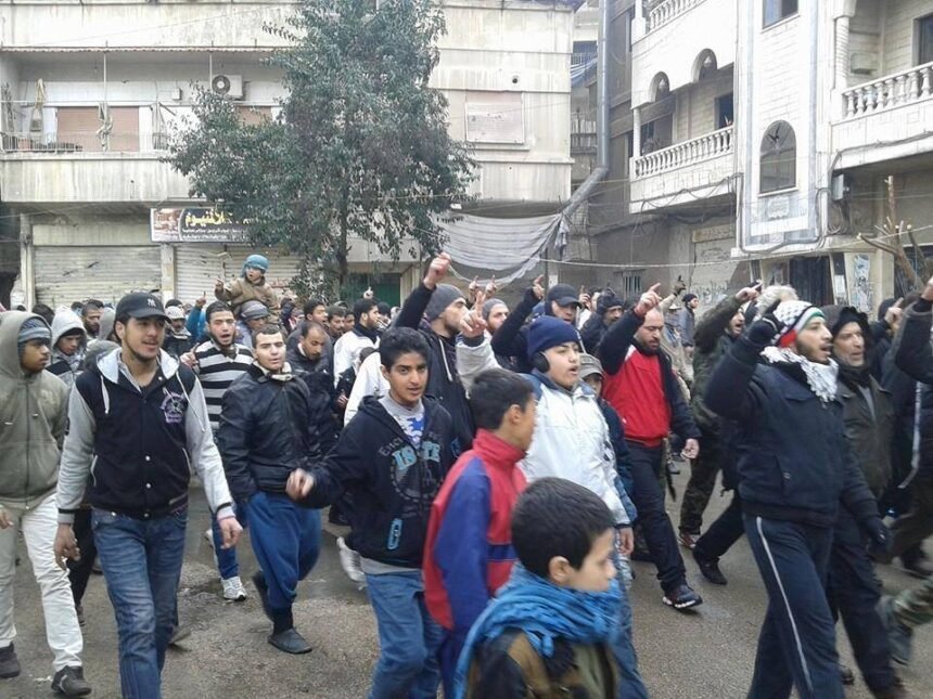 تلبية لدعوات الخروج في مظاهرات يوم الجمعة نصرة لرسول الله صلى الله عليه وسلم ، خرج أبناء مخيم اليرموك المحاصر بعد صلاة الجمعة مظاهرة طافت شوارع المخيم ، عبر خلالها المتظاهرون عن استنكارهم للرسوم المسيئة للنبي محمد صلى الله عليه وسلم وإعادة نشرها .