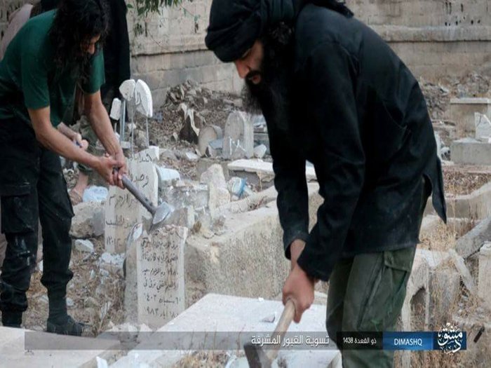 نشر تنظيم “داعش” يوم أمس على صفحات الموقع الاجتماعي (الفيس بوك) عدد من الصور تظهر قيام عناصره بتحطيم شواهد القبور في مخيم اليرموك للاجئين الفلسطينيين بحجة (تسوية القبور المشرفة)، من جانبه ذكر مراسل مجموعة العمل أن عناصر تنظيم الدولة قاموا في وقت سابق بالاعتداء على القبور في مقبرة مخيم اليرموك الجديدة (مقبرة التقدم)، وذلك بهدمهم شواهد القبور بحجة قيامهم بـ “تطبيق الشرع”، وأضاف مراسلنا أن تنظيم الدولة منع الأهالي من زيارة القبور.