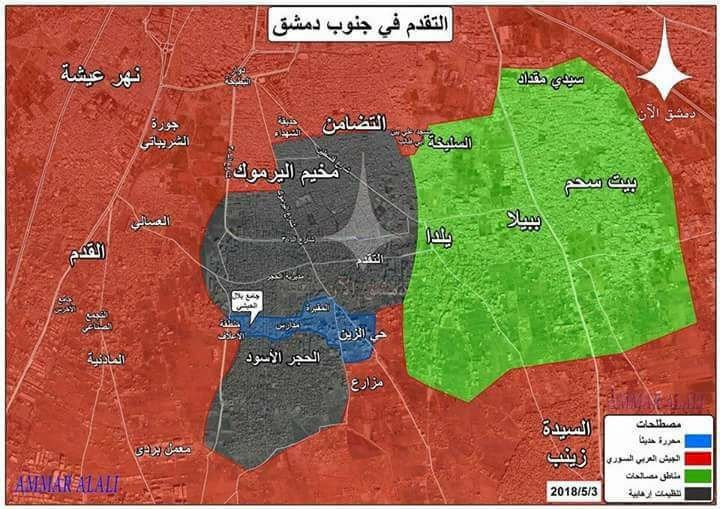 وبحسب ما أعلنته وسائل إعلام محسوبة على النظام السوري فإن قوات النظام تمكنت من توسيع أماكن سيطرتها جنوب دمشق مما ساعدها على الفصل بين مخيم اليرموك وأجزاء من حي الحجر الأسود وبقية أحياء الحجر الأسود.