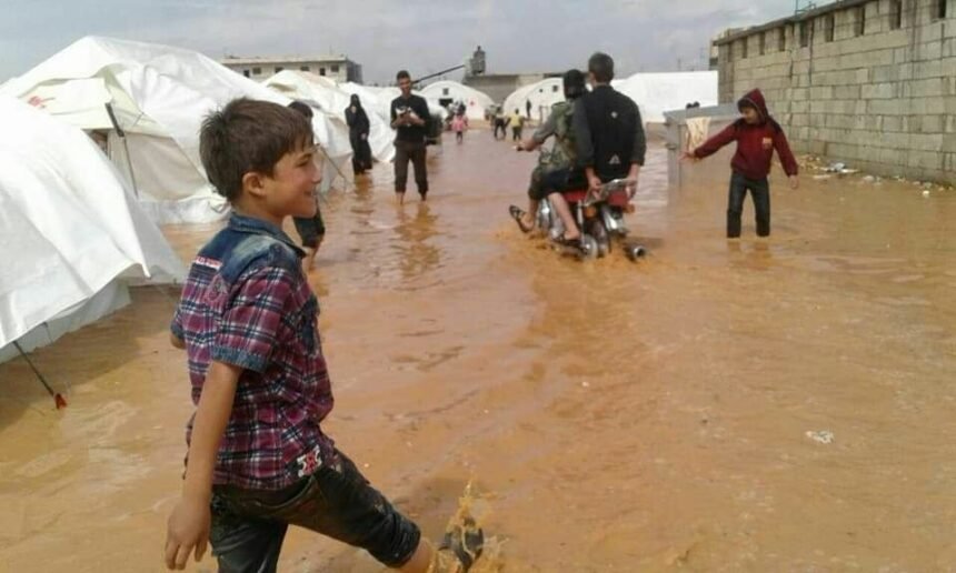 شاهد: الأمطار تغمر الخيام التي يقطنها أبناء مخيم اليرموك الذين اضطروا للخروج من جنوب دمشق إلى الشمال السوري.